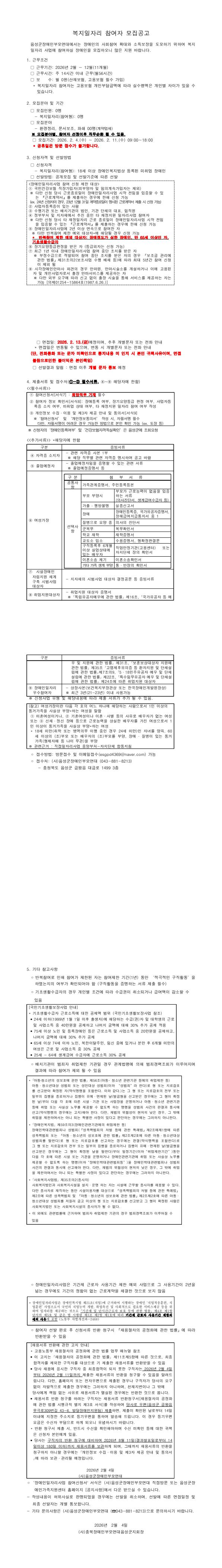 [음성군지회] (사)충북장애인부모연대 장애인복지일자리 모집공고
