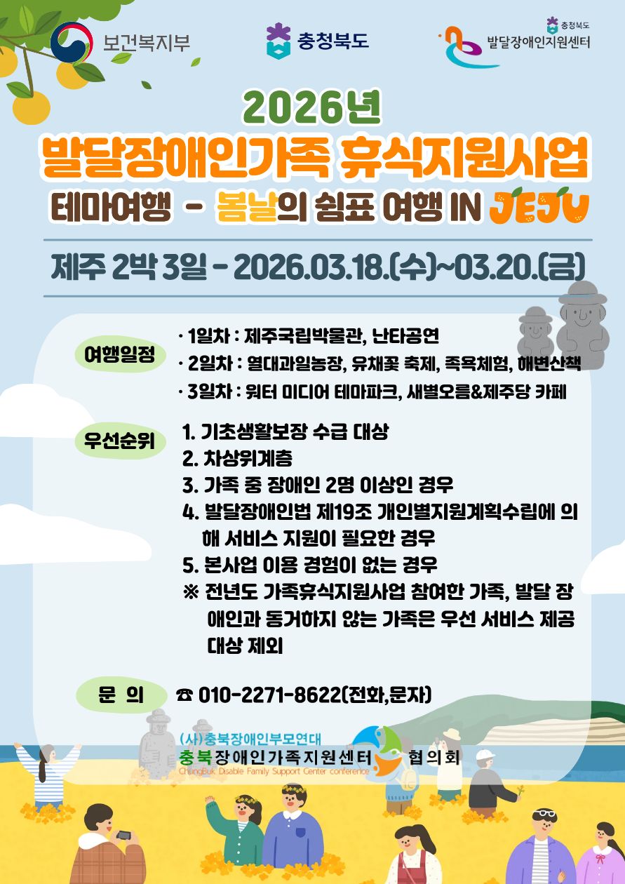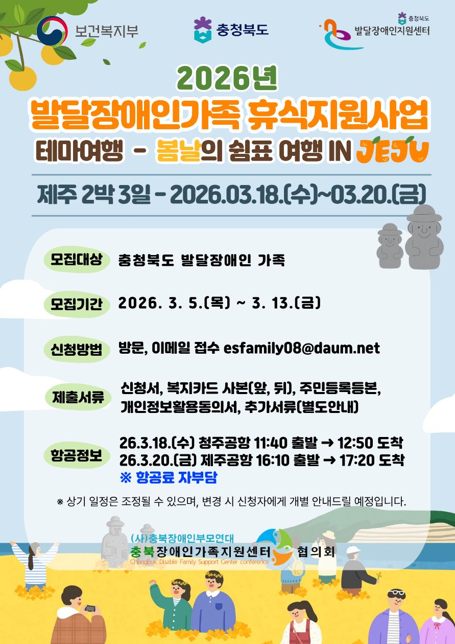 [참여자모집] 2026년 충청북도 발달장애인 가족휴식지원사업 '테마여행-제주도' 참여자 모집 안내
